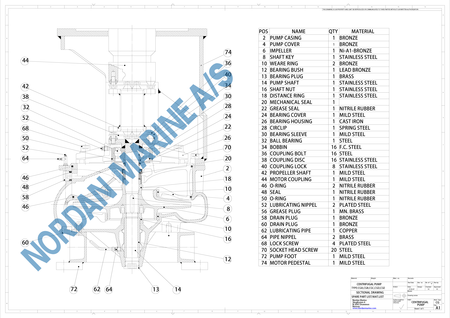 Nordan Marine's CG replacement pump is designed for a long and reliable service life and constructed as single stage vertical centrifugal pump. The logical assembly and minimum assembly parts make both inspection and maintenance easy to carry out because the pump are radically split and the complete rotating element can be dismantled independently of electric motor and piping connections.